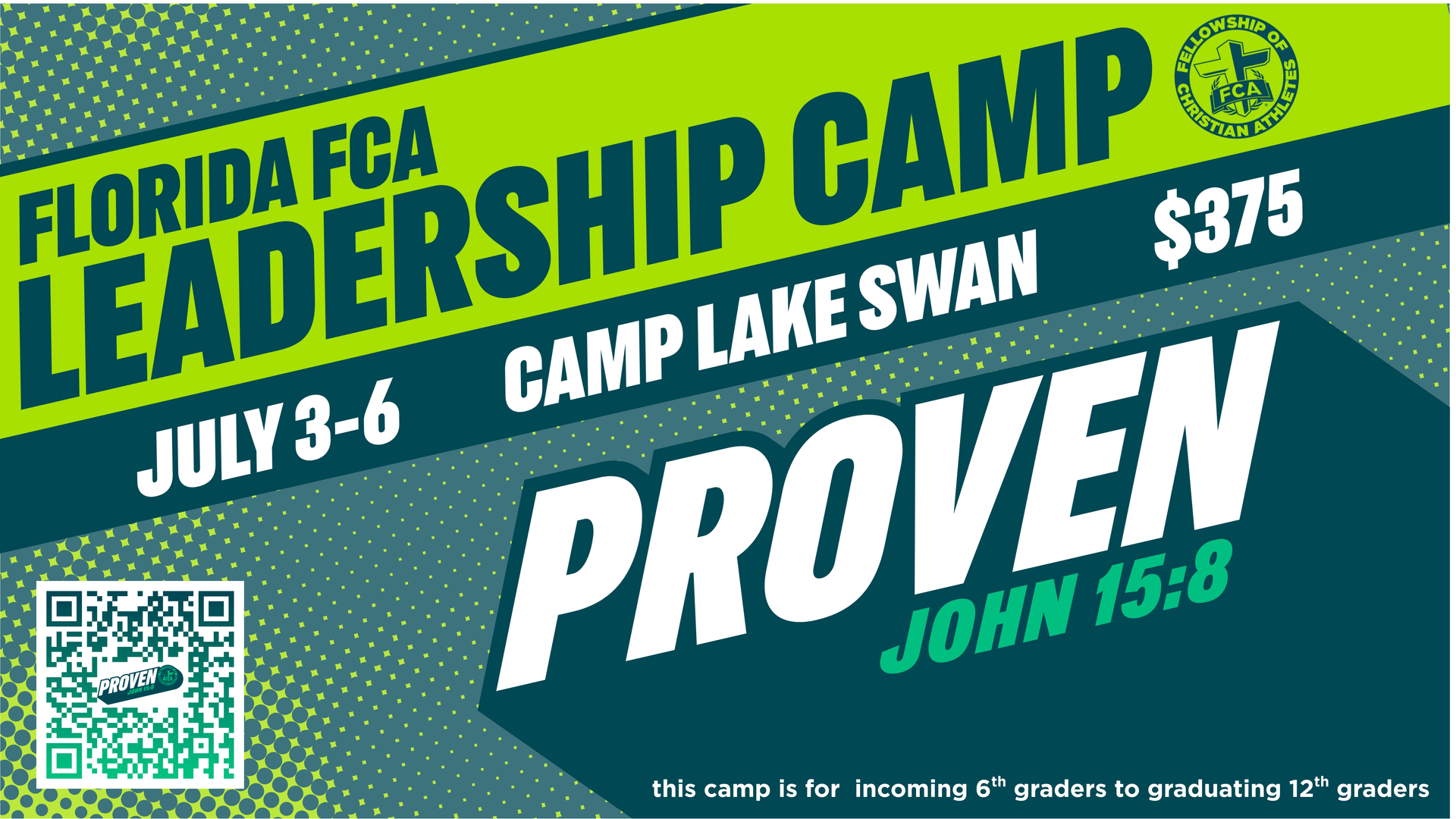 North Florida's FCA Leadership Camp equips students to be effective leaders on their campuses and in their communities. Open to rising 6th graders; July 3 -6. It is an overnight camp from Friday to Monday at Lake Swann for students interested in serving on their school's FCA Leadership team during the school year. They will learn skills to be an effective leader for their School's Huddle while growing their relationship with their peers and with the Lord.